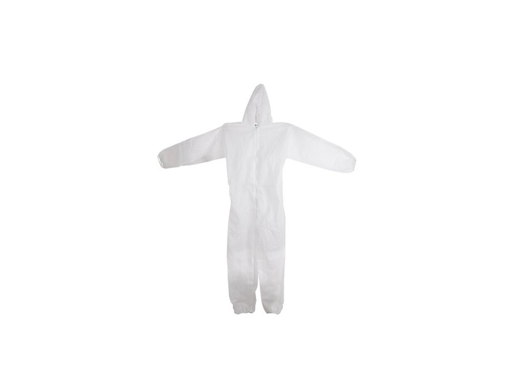 Kombinéza s elastickou kapucí, elastické manžety a pas, zapínání na zip, polypropylen 40 g/m, barva bílá, velikost XL.Doplňkové parametry