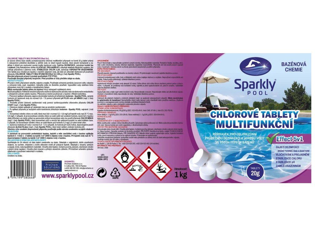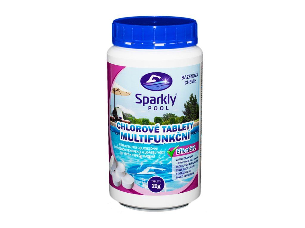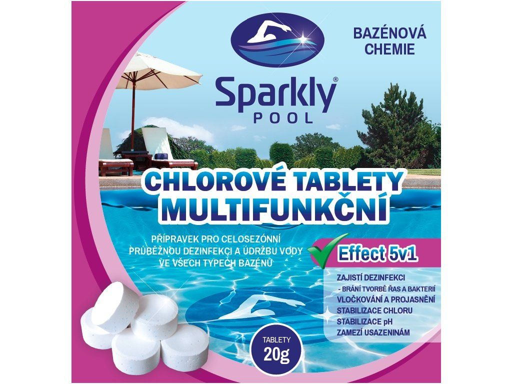 je vysoce účinný beze zbytku pomalurozpustný chlorový multifunkční přípravek ve formě 20 g tablet určený k celosezónní průběžné dezinfekci a údržbě vody ve všech typech bazénů, který působí komplexně a zajišťuje 5 účinků pro zachování vysoké kvality bazénové vody. Zajišťuje DEZINFEKCI, zabraňuje tvorbě řas a bakterií. Díky flokulačnímu účinku VLOČKUJE, PROJASŇUJE a zlepšuje efektivitu filtračního systému, tím udržuje průzračnou a jiskrnou vodu. STABILIZUJE CHLOR a pH, zamezuje VÁPENATÝM USAZENINÁM. Tyto tablety jsou vhodné pro bazény s menším objemem vody, ale také pro přesnější dávkování při používání přípravku CHLOROVÉ TABLETY MULTIFUNKČNÍ Effect 5v1 200 g (z řady Sparkly POOL).