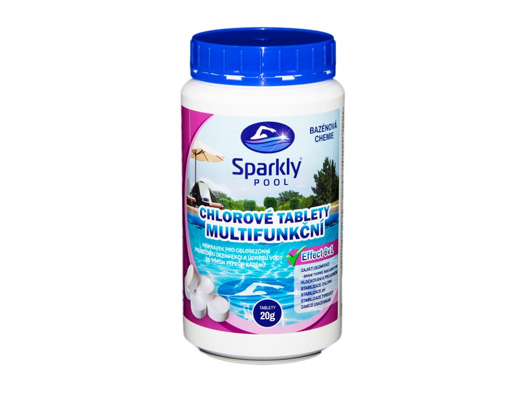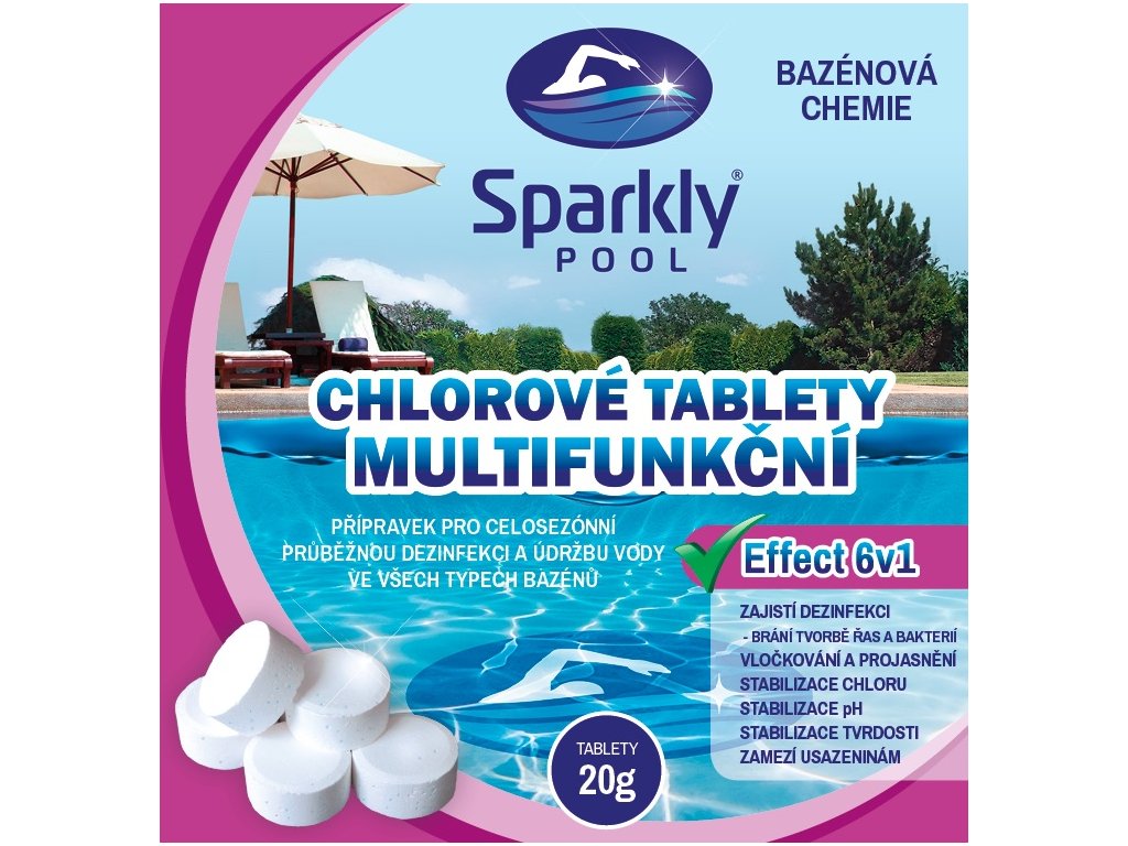 je vysoce účinný beze zbytku pomalurozpustný chlorový multifunkční přípravek ve formě 20 g tablet určený k celosezónní průběžné dezinfekci a údržbě vody ve všech typech bazénů, který působí komplexně a zajišťuje 6 účinků pro zachování vysoké kvality bazénové vody. Zajišťuje DEZINFEKCI, zabraňuje tvorbě řas a bakterií. Díky flokulačnímu účinku VLOČKUJE, PROJASŇUJE a zlepšuje efektivitu filtračního systému, tím udržuje průzračnou a jiskrnou vodu. STABILIZUJE CHLOR, pH, TVRDOST a zamezuje VÁPENATÝM USAZENINÁM. Tyto tablety jsou vhodné pro bazény s menším objemem vody, ale také pro přesnější dávkování při používání přípravku CHLOROVÉ TABLETY MULTIFUNKČNÍ Effect 6v1 200 g (z řady Sparkly POOL).