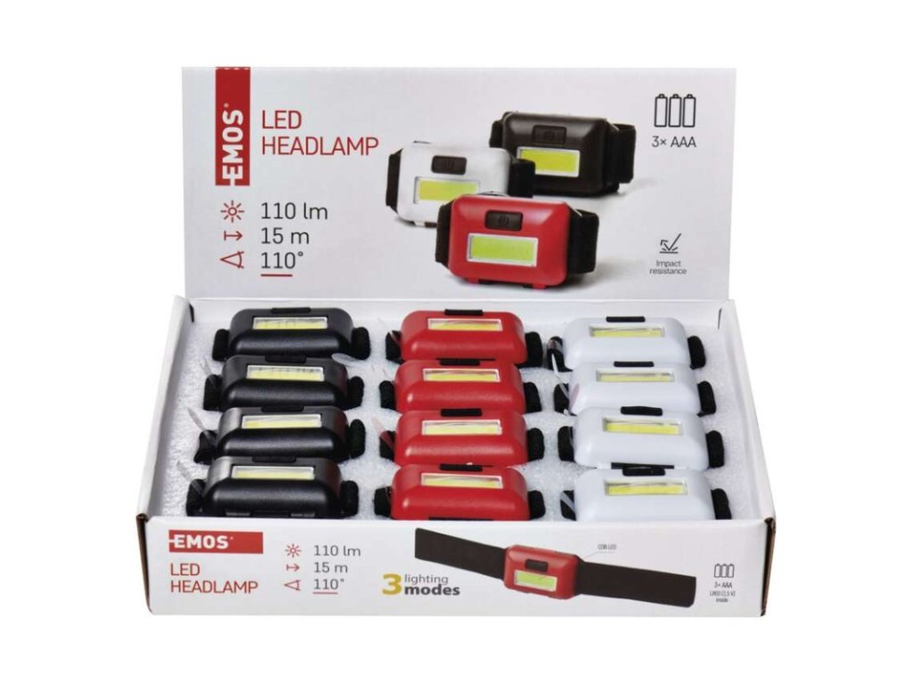 Produkt: COB LED čelovka P3538, 110 lm, 3× AAA, 12 ks, display boxTechnické parametry: