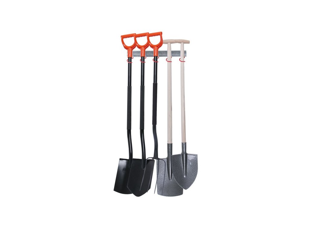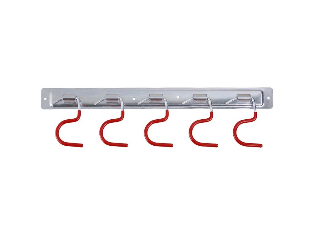 Praktický kovový držák zahradního nářadí na stěnu, 5 ks pohyblivých kovových háčků. Výhodou je velká skladovatelnost a přehlednost pověšeného zahradního nářadí, celková délka držáku : 450 mm.Doplňkové parametry
