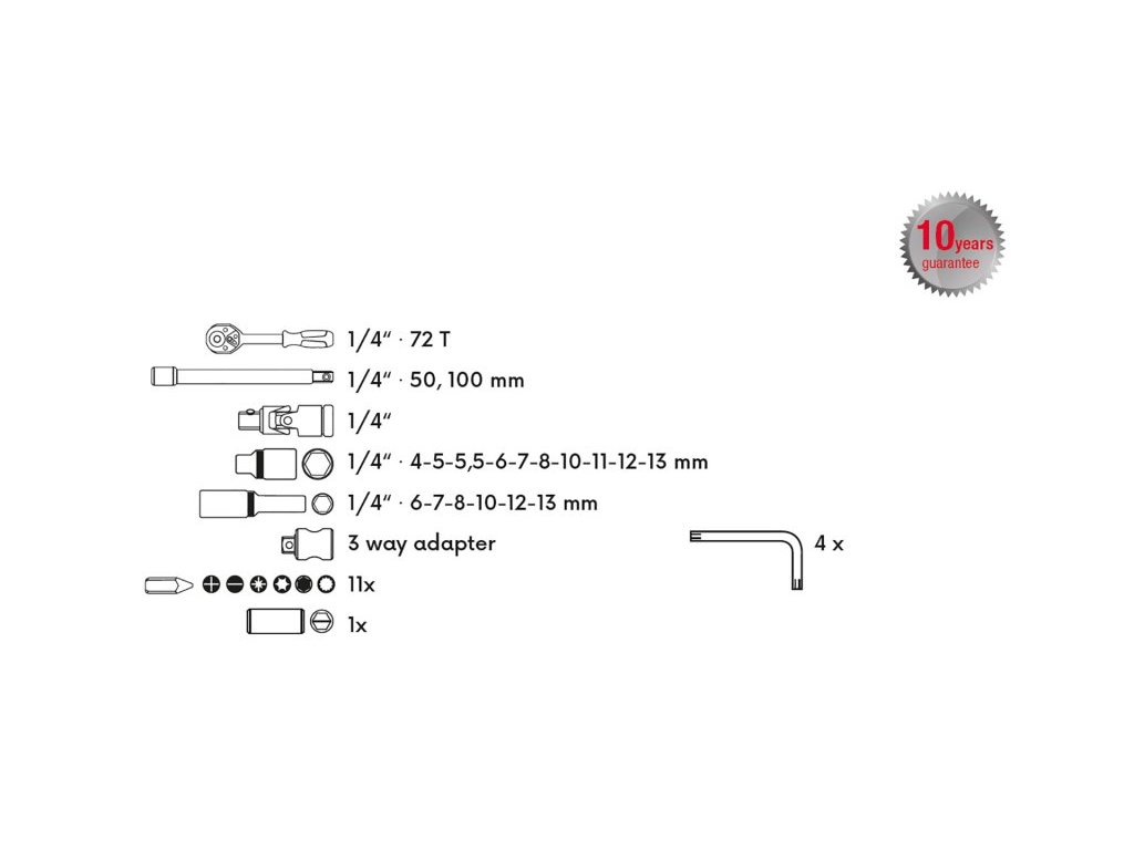 Kvalitní gola sada je vhodná díky kvalitě použitých materiálů a zpracování v profesionální autodílně nebo servisu. 10 let záruka. Všechny části jsou vyrobeny z vysoce kvalitní chrom-vanadiové oceli. Niklová povrchová úprava. Hroty bitů jsou ze slitiny oceli S2. Ráčny mají jemné dělení 72 zubů, tělo ráčny z CrV oceli, zubový mechanismus z S2 oceli, ergonomicky tvarovanou rukojeť se zdravotně nezávadnou gumou. Nový design plastového kufru z primárního materiálu s kovovými uzávěry a panty víka.Doplňkové parametry