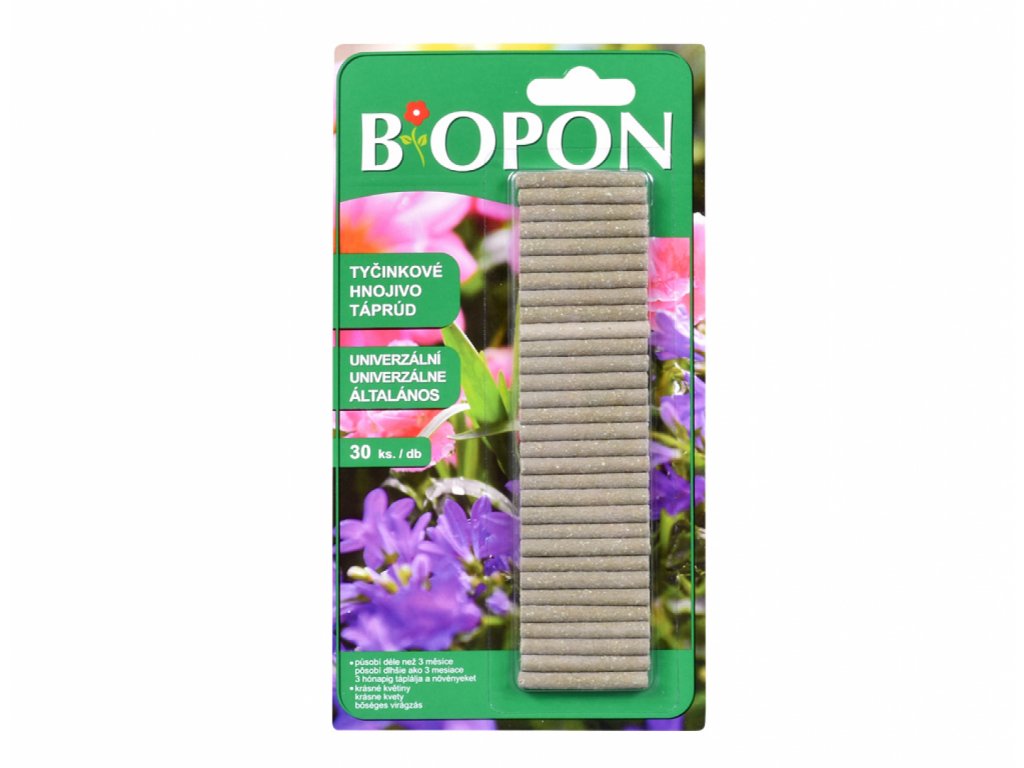 Univerzální hnojivové tyčinky jsou určeny pro všechny balkónové a pokojové rostliny. Dodávají rostlině živiny po dobu 2 měsíců. Jsou plně rozpustné. Každá tyčinka systematicky dodává rostlinám živiny. Dusík obsažený v hnojivu je základní složkou rostlin, fosfor má vliv na pravidelný růst a draslík zodpovídá za procesy kvetení. Složení: dusík-fosfor-draslík (10-6-6). Dávkování: dle velikosti květníku. Balení: 30 ks.Doplňkové parametry