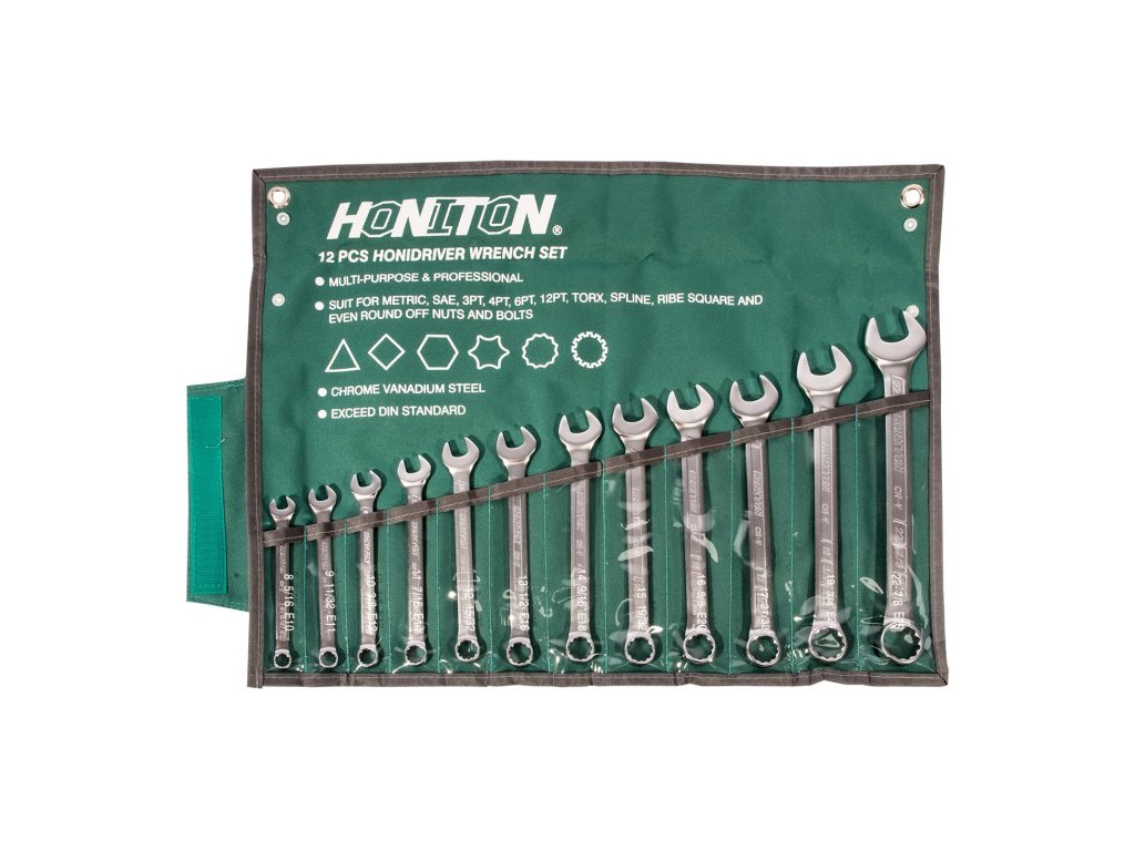 Produkt: HONITON Sada očkoplochých klíčů vyhnutých 12 dílů HONIDRIVER | 8-22 mm, textilní obalOčkoplochý klíč s patentem HONIDRIVER (překonává hranice běžného klíče. Každá hrana klíče má svou úlohu pro správné nasazení a povolení daného šroubu).