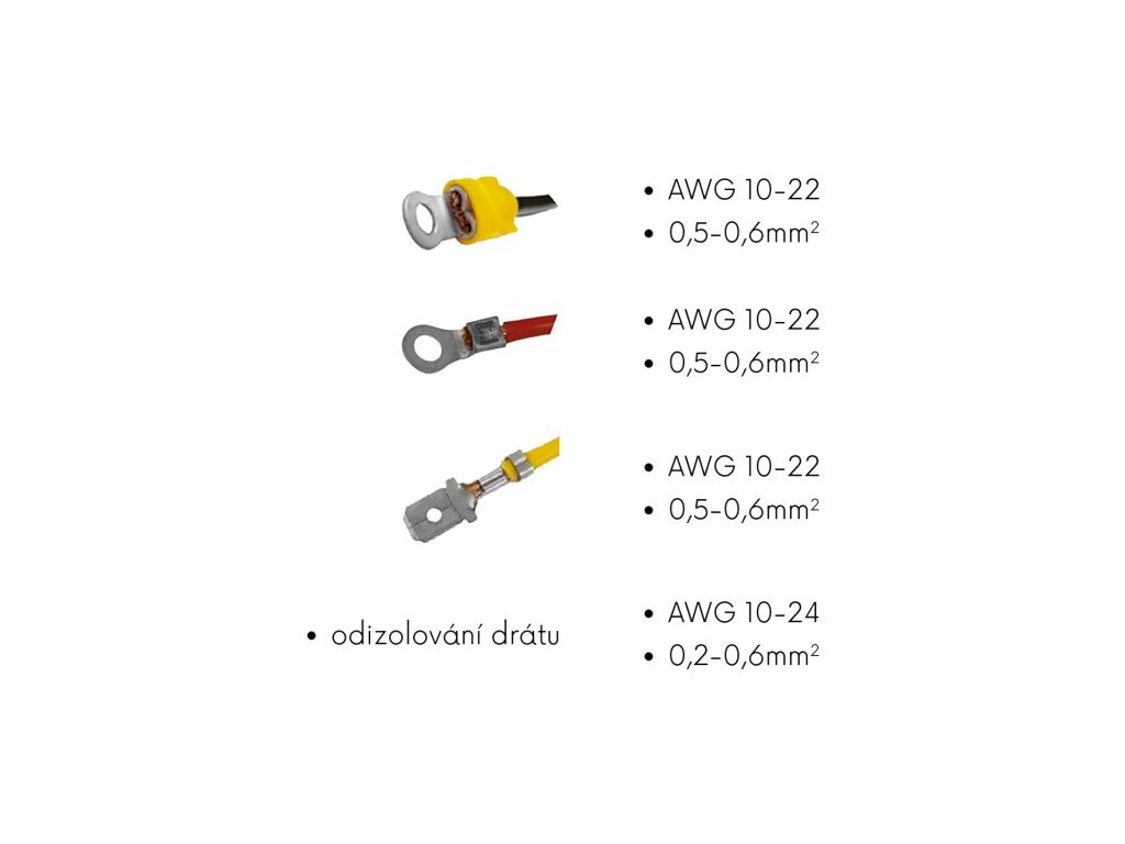 - v rukojeti integrované čelisti na lisování / klrimpování koncovek - IZOLOVANÉ i NEIZOLOVANÉ v rozsahu 0.5 - 6.0 mm (AWG 10-22)