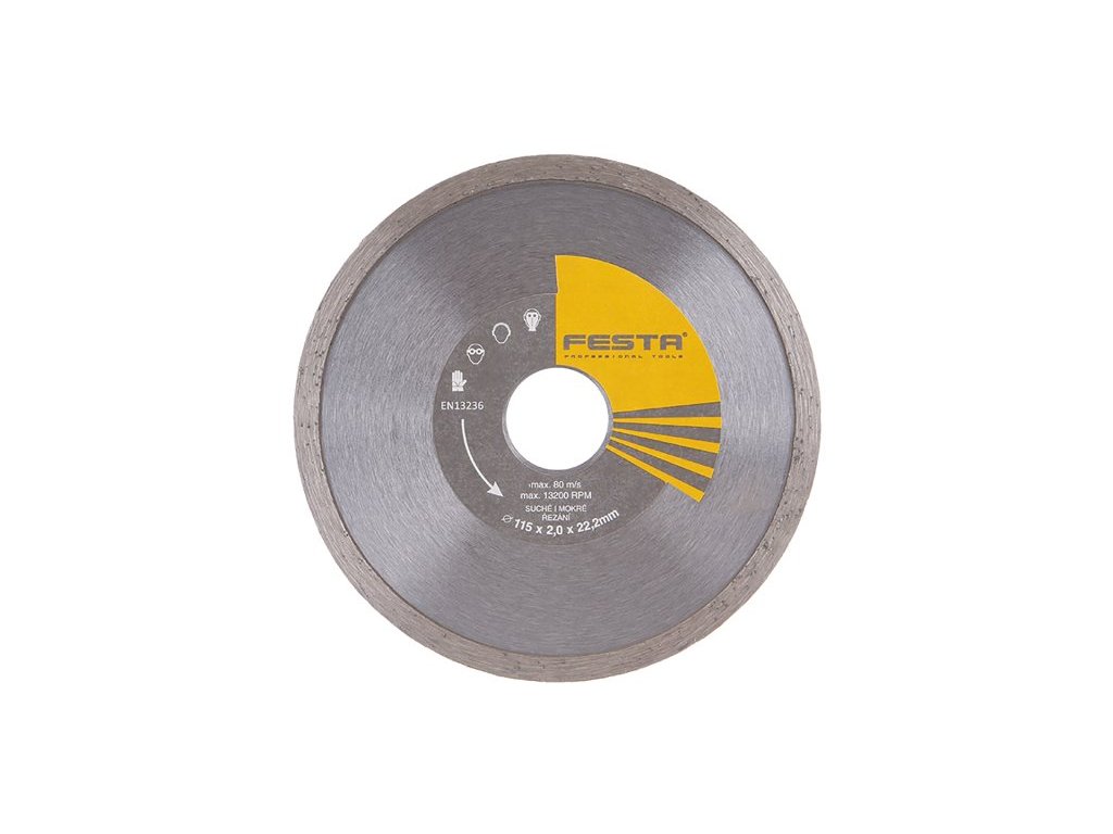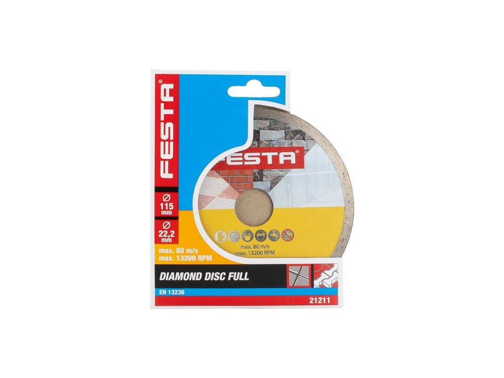 Profesionální diamantový kotouč FESTA, provedení : PLNÝ - celoobvodový, kvalitní diamantová vrstva s vysokým obsahem diamantového prachu, přesné zpracování - napojení na nosný disk kotouče odolávající vysokým teplotám, použití : určený pro mokré i suché řezání dlažby a obkladů, betonu, cihel, zdiva, žuly, mramoru, kamene, skla, keramiky, balení : blistr s eurootvorem, rozměry : uvedeny v názvu výrobku.Doplňkové parametry