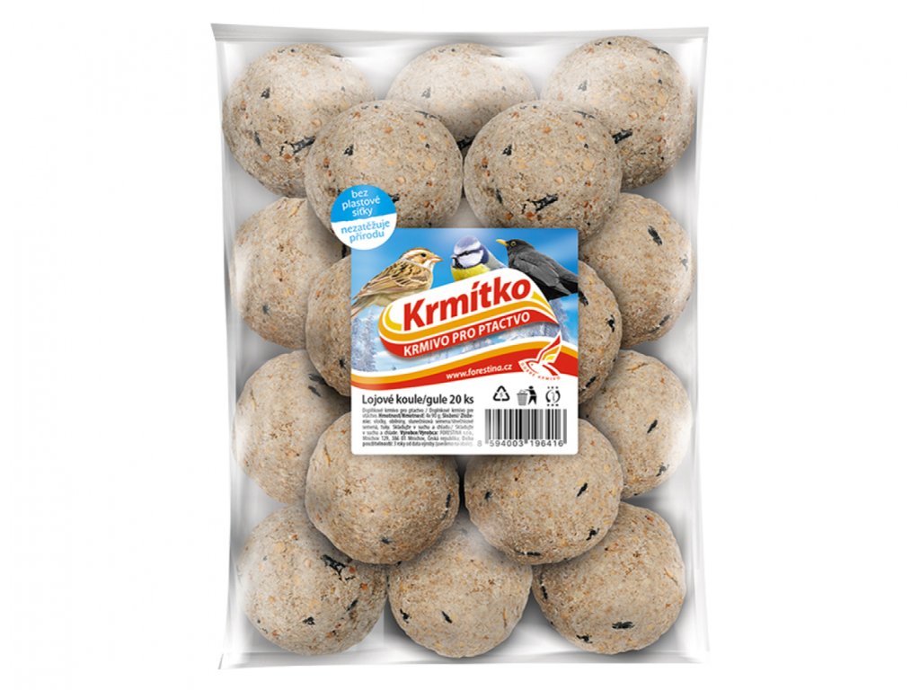 Lojová koule Krmítko je vhodná pro venkovní ptactvo jako doplňkové krmivo. V letních měsících slouží jako příkrm, v zimě při nedostatku potravy jako důležitá část krmiva ptactva. Kouli je třeba umístit na místo chráněné před deštěm. Je v síťce, kterou je možné v případě umístění do krmítka sundat. Skládá se z ovesných a pšeničných vloček, obilí, jader slunečnice a rostlinných olejů. V balení je 20 lojových koulí po 90 gramech.Doplňkové parametry