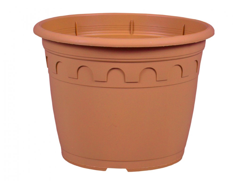 Plastový, lehčený květník na květiny s matným povrchem. Květník je jemně kónický, hladký a v horní části má vylisované obloučky a proužky, což mu dodává charakteristický, klasický vzhled. Horní lem je ohnutý směrem ven pro lepší manipulaci. Dvouúrovňové dno zajišťuje dobrou drenáž při pěstování. Rozměry: průměr 16cm, výška 12cm. Objem 1,5l. Barva: terakota.Doplňkové parametry