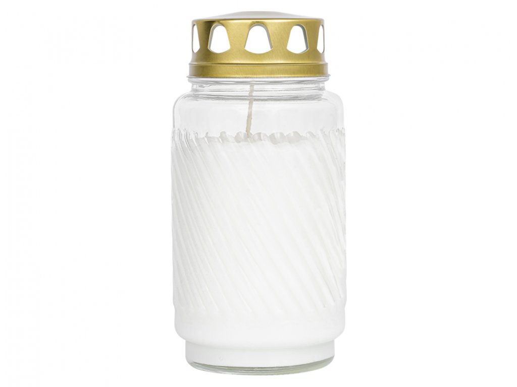 Hřbitovní lampa skleněná, zdobena vystouplými šikmými pruhy, které se vinou po celém obvodu. Se zlatým víčkem. Má jasný plamen a recepturu vosku, který hoří za každého počasí. Bez palmového oleje. Vosk je nalitý přímo do skla. Hmotnost náplně: 380 g. Rozměry: průměr 9 cm, výška 17 cm. Doba hoření: 100 hodin. Barva: bílá.Doplňkové parametry