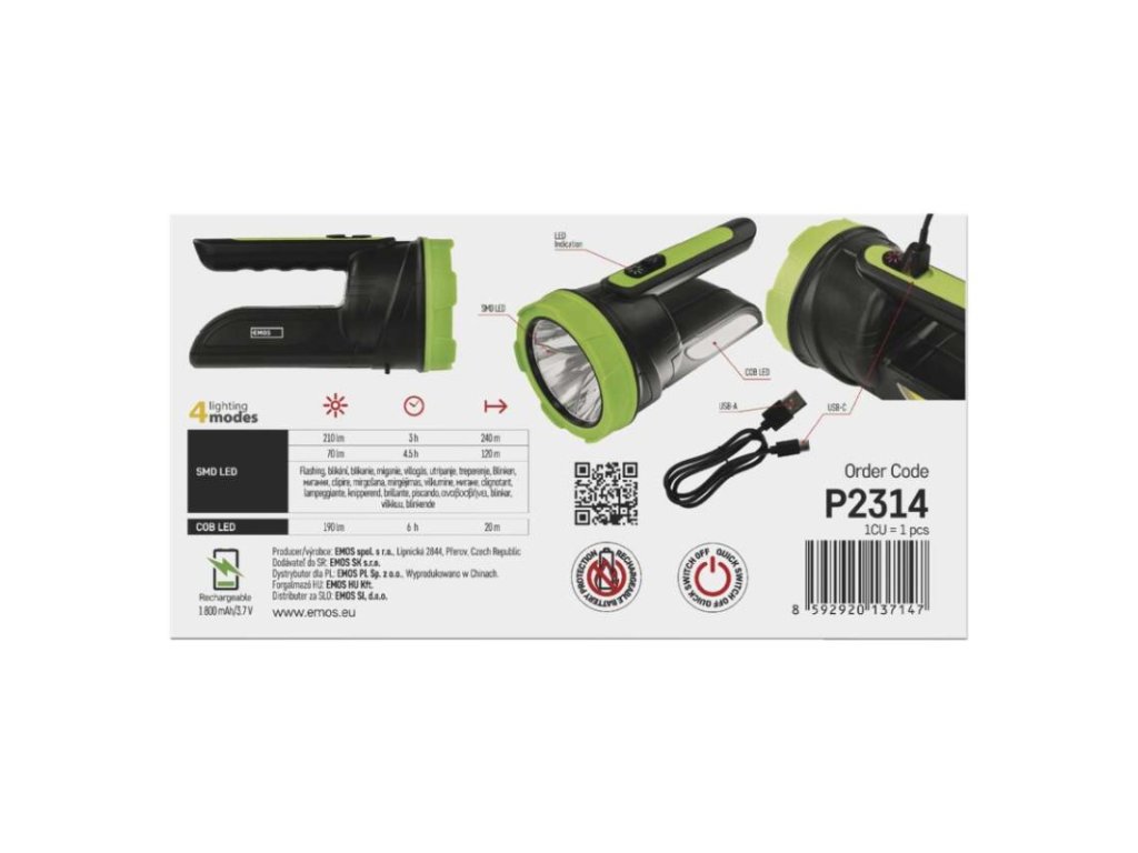 Produkt: LED nabíjecí svítilna, 210 lm, 1 800 mAhTechnické parametry: