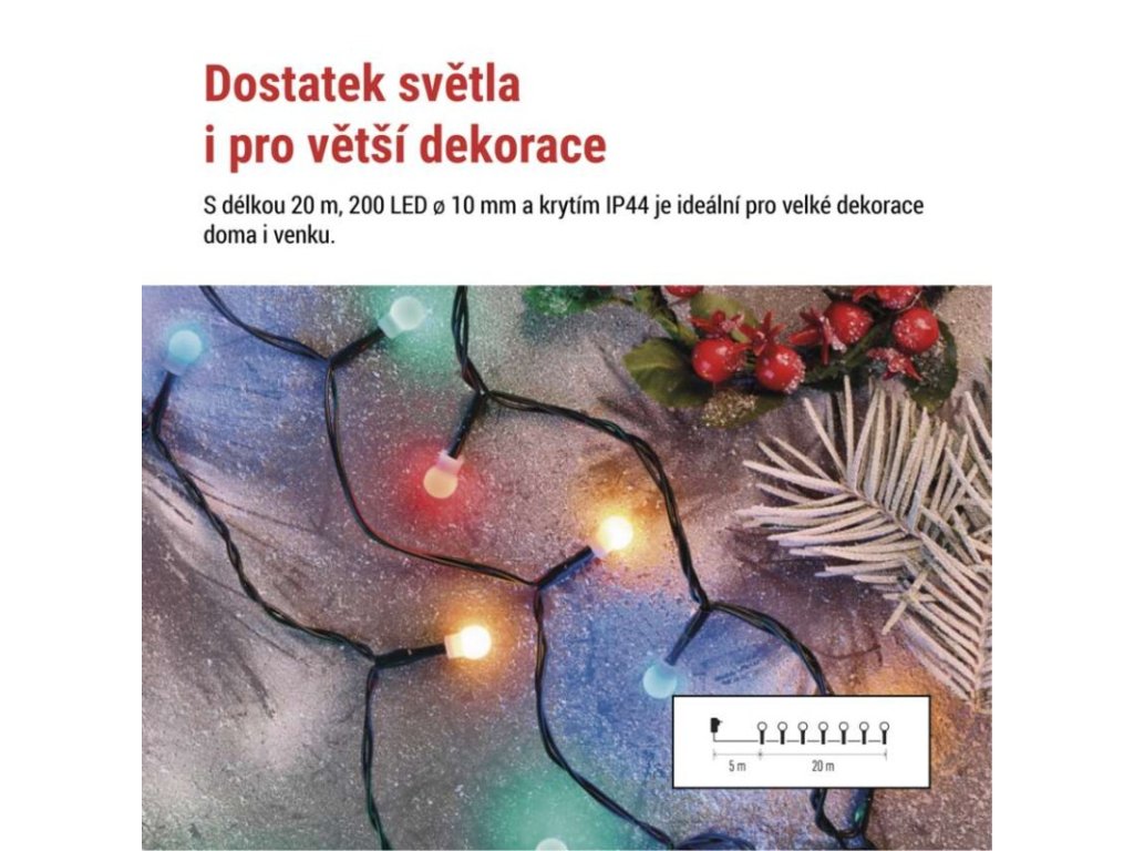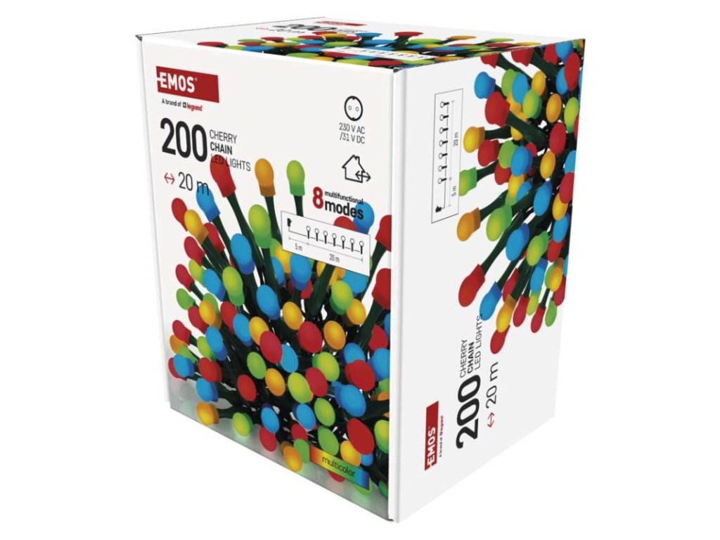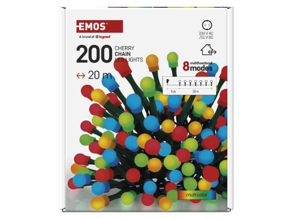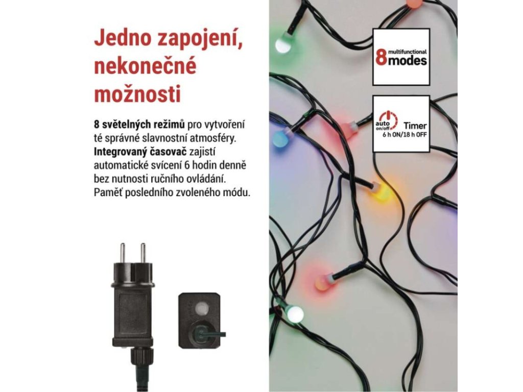 Produkt: LED vánoční cherry řetěz – kuličky, 20 m, venkovní i vnitřní, multicolor, programy,časovačTechnické parametry: