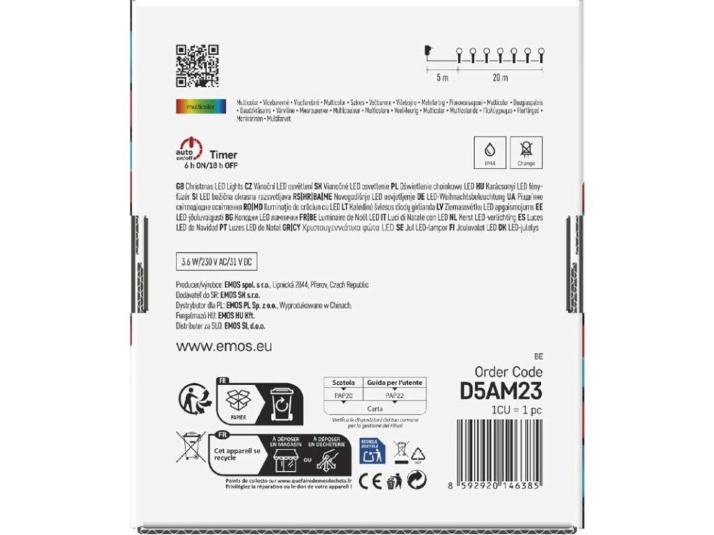 barva drátu: zelenábarva světla: multicolorčasovač: anodálkový ovladač: nedalší funkce: –délka přívodu: 5 mfunkce: 8 módů (multifunkce)jazyky aplikace: –kompatibilita: –krytí: IP44LED mezera: 10 cmmateriál: PVCmožnost propojení: nenotifikace do mobilní aplikace: neovládání hlasovými asistenty: nepočet LED: 200podporované OS: –použití: venkovní i vnitřnípřenosová frekvence: –příkon: 3,6 Wprodejní obal: 1 ks, krabiceprodukt: řetězprotokol: –pro výšku stromu: 210 cmrozměr: 20 mtvar: kuličkatyp napájení: síťový adaptérvelikost LED: 10 mmvstupní napětí: 230 V ACvýstupní napětí: 31 V DCzáruční doba: 2 rokyživotnost: 10 000 hodin