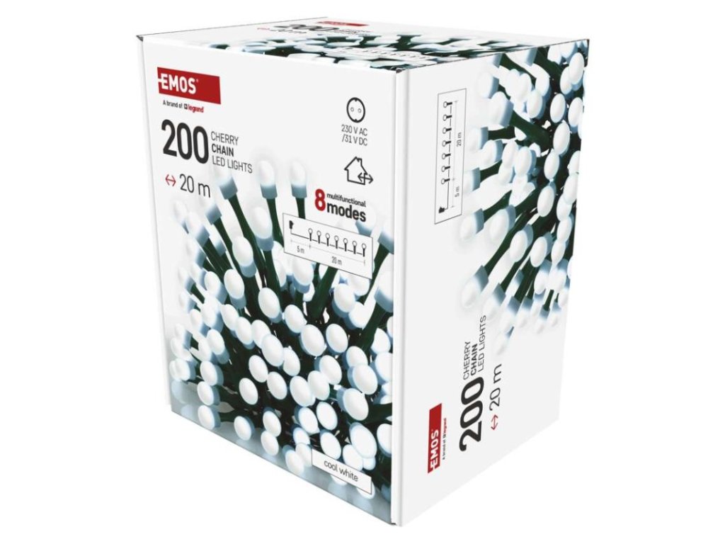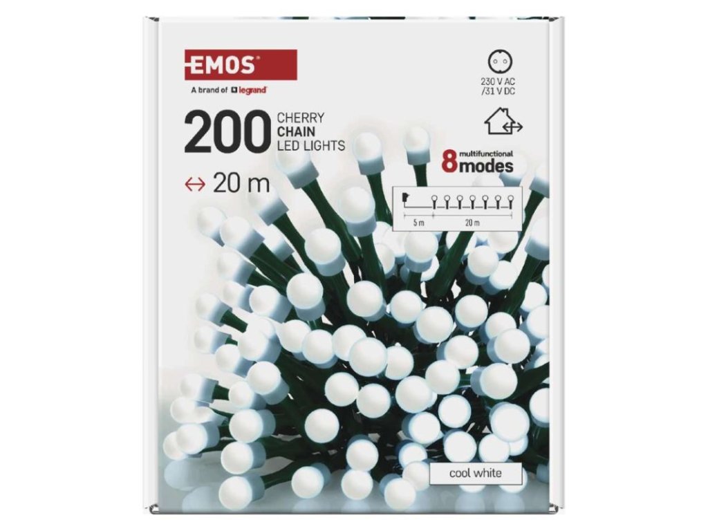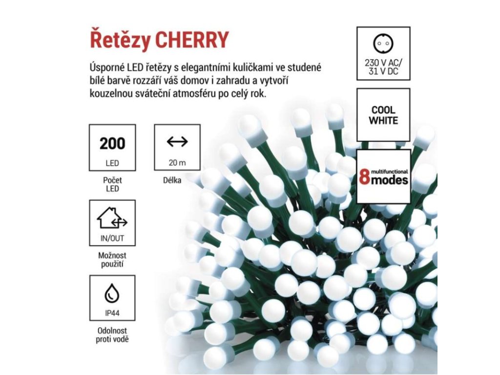 Produkt: LED vánoční cherry řetěz – kuličky, 20 m, venkovní i vnitřní,studená bílá,programy,časovačTechnické parametry: