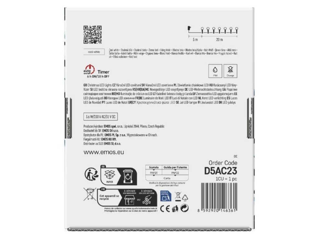 barva drátu: zelenábarva světla: studená bíláčasovač: anodálkový ovladač: nedalší funkce: –délka přívodu: 5 mfunkce: 8 módů (multifunkce)jazyky aplikace: –kompatibilita: –krytí: IP44LED mezera: 10 cmmateriál: PVCmožnost propojení: nenotifikace do mobilní aplikace: neovládání hlasovými asistenty: nepočet LED: 200podporované OS: –použití: venkovní i vnitřnípřenosová frekvence: –příkon: 3,6 Wprodejní obal: 1 ks, krabiceprodukt: řetězprotokol: –pro výšku stromu: 210 cmrozměr: 20 mtvar: kuličkatyp napájení: síťový adaptérvelikost LED: 10 mmvstupní napětí: 230 V ACvýstupní napětí: 31 V DCzáruční doba: 2 rokyživotnost: 10 000 hodin