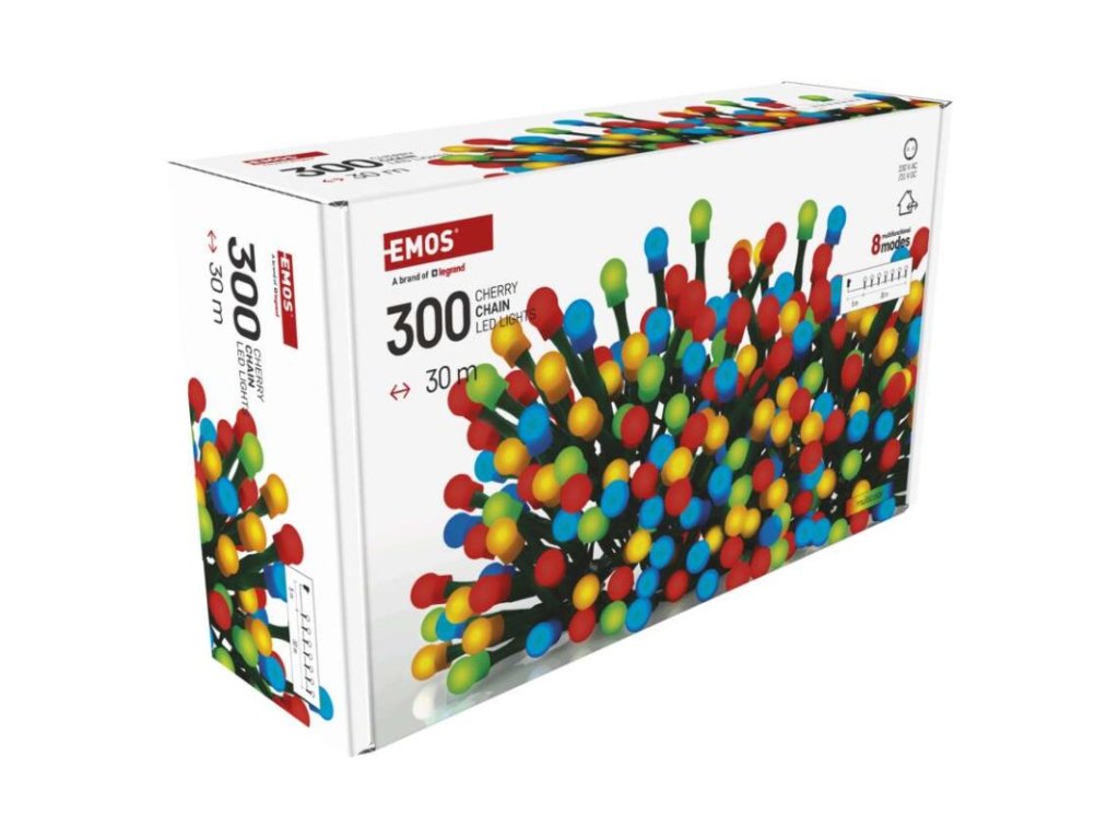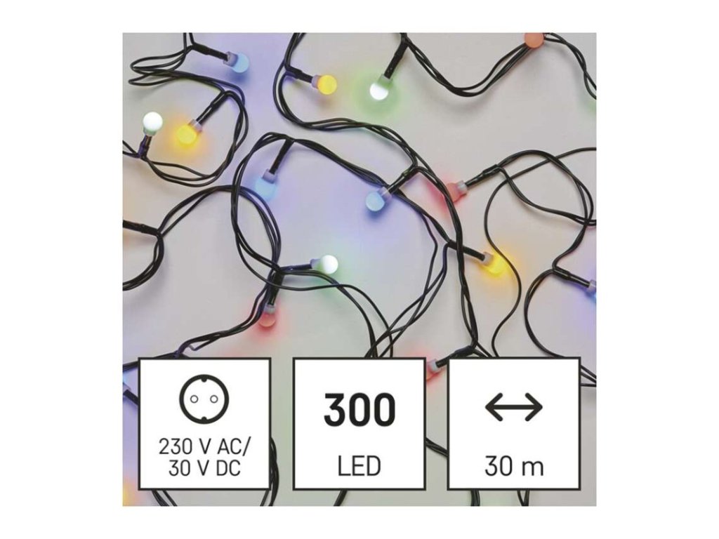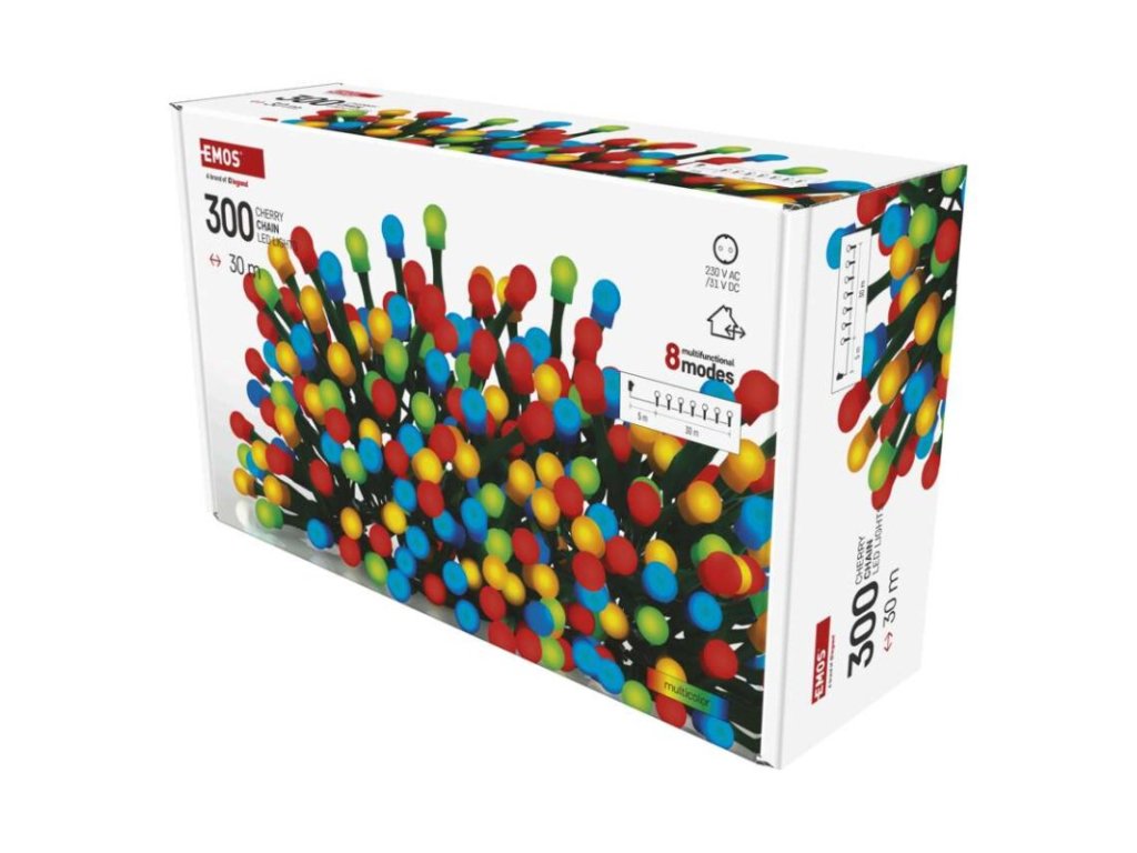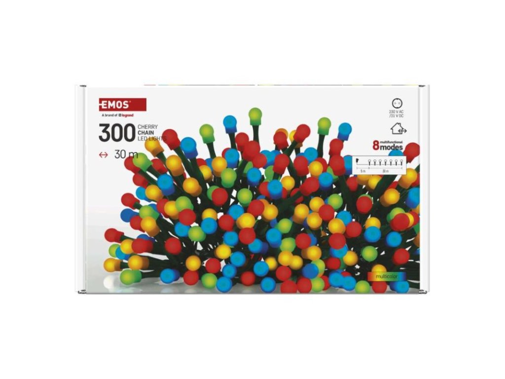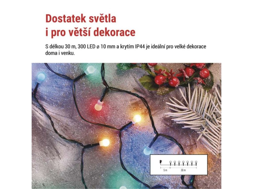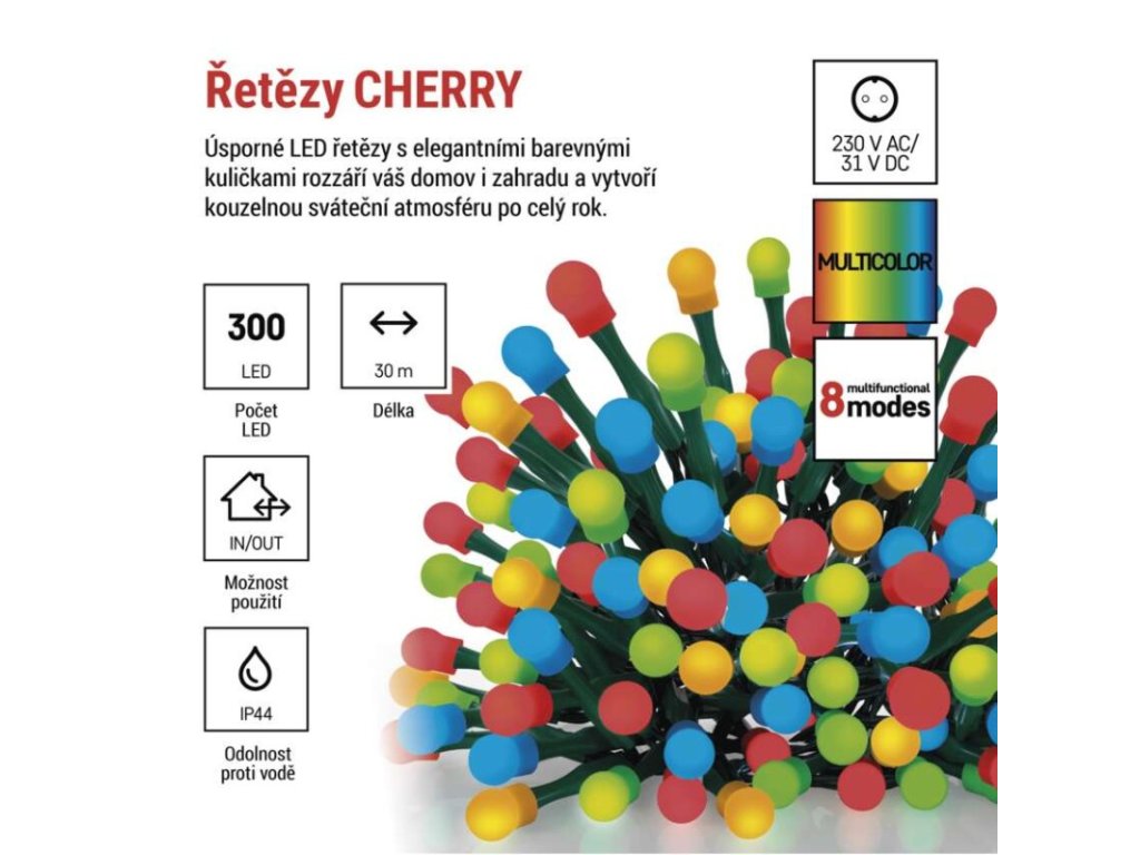 Produkt: LED vánoční cherry řetěz – kuličky, 30 m, venkovní i vnitřní, multicolor, programy,časovačTechnické parametry: