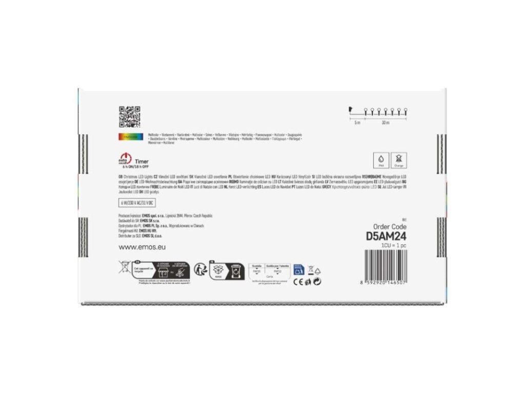 barva drátu: zelenábarva světla: multicolorčasovač: anodálkový ovladač: nedalší funkce: –délka přívodu: 5 mfunkce: 8 módů (multifunkce)jazyky aplikace: –kompatibilita: –krytí: IP44LED mezera: 10 cmmateriál: PVCmožnost propojení: nenotifikace do mobilní aplikace: neovládání hlasovými asistenty: nepočet LED: 300podporované OS: –použití: venkovní i vnitřnípřenosová frekvence: –příkon: 6 Wprodejní obal: 1 ks, krabiceprodukt: řetězprotokol: –pro výšku stromu: 250 cmrozměr: 30 mtvar: kuličkatyp napájení: síťový adaptérvelikost LED: 10 mmvstupní napětí: 230 V ACvýstupní napětí: 31 V DCzáruční doba: 2 rokyživotnost: 10 000 hodin