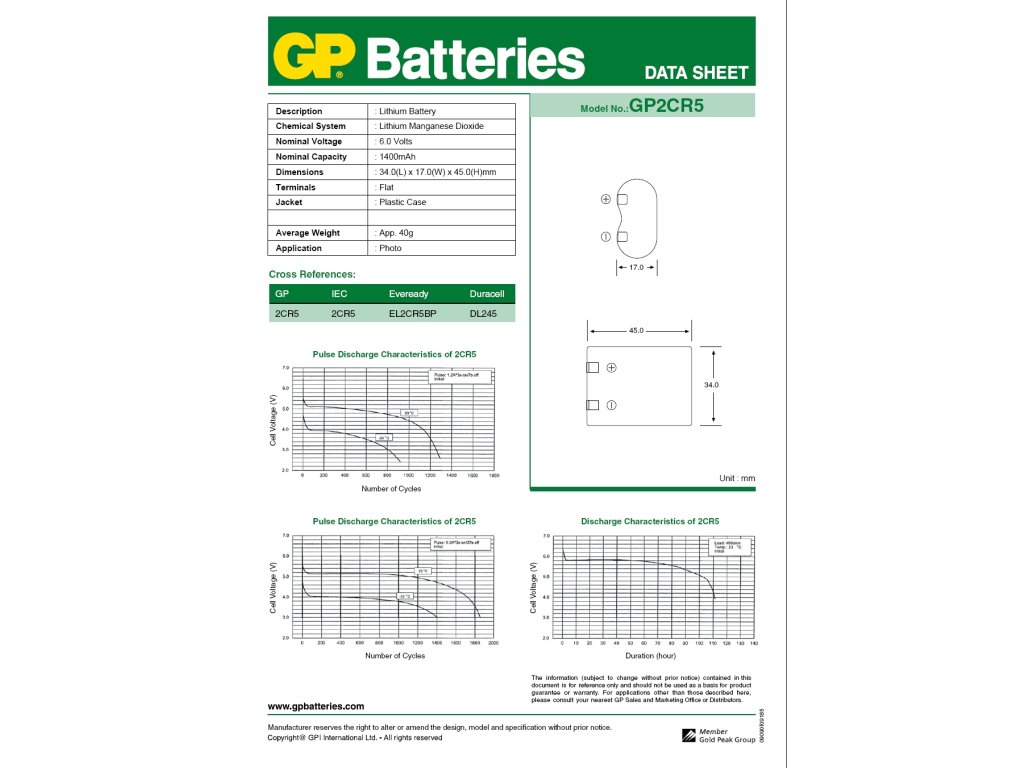 Produkt: Lithiová baterie GP 2CR5, 1 ksTechnické parametry: