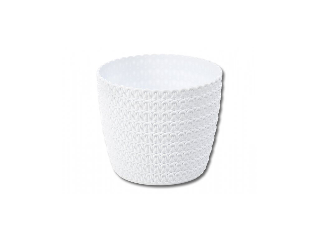 Plastový obal na květník s efektem evokujícím pletenou látkou. Je vhodný do interiéru, na balkón či terasy. Je odolný vůči poškrábání. Průměr: 14 cm, výška: 12 cm.Doplňkové parametry