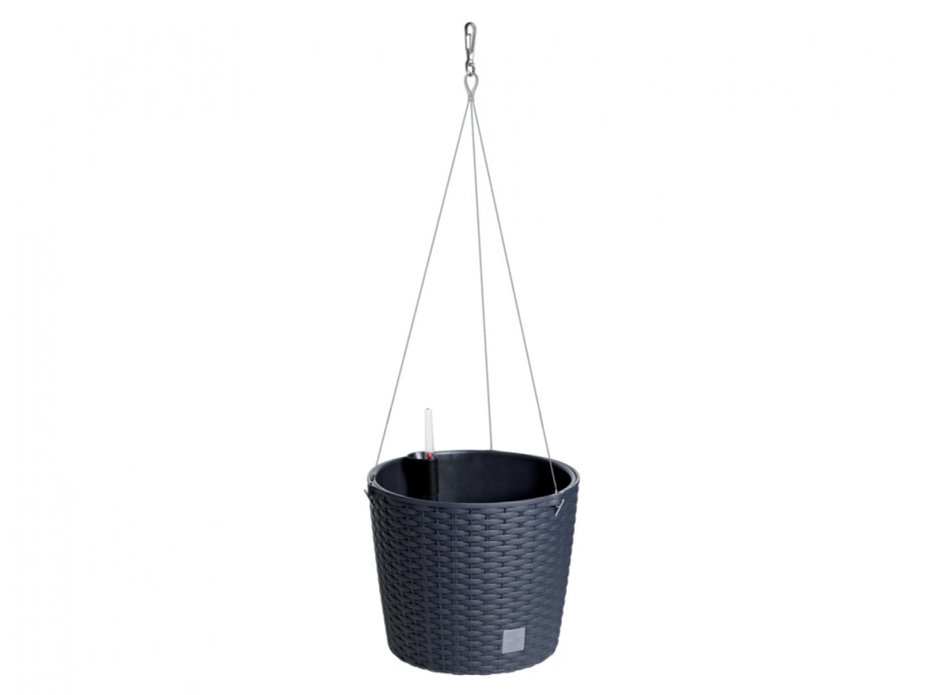 Plastový samozavlažovací obal, závěsný. Vyroben z kvalitního plastu v oblíbeném designu imitujícím ratan. Obsahuje vyjímatelnou vložku sloužící k osazení rostlinou, hladinoměr pro sledování množství vody a kovový závěs. Elegantní a praktické řešení pro zavěšování rostlin. Kruhového půdorysu. Objem nádoby je 8,9 l, objem vyjímatelné vložky je 6,5 l. Rozměry: průměr 26cm, výška 22 cm. Barva: antracitová.Doplňkové parametry