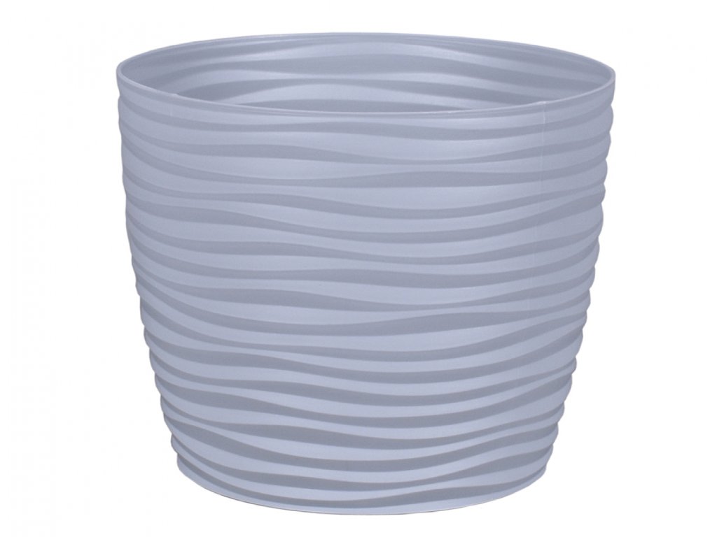 Matný plastový obal na květník s jemnými vlnkami po celém obvodu. Kruhového půdorysu. Neotřelý design a trendy barva osvěží každý interiér. Průměr: 11 cm, výška: 9 cm. Barva: šedá.Doplňkové parametry