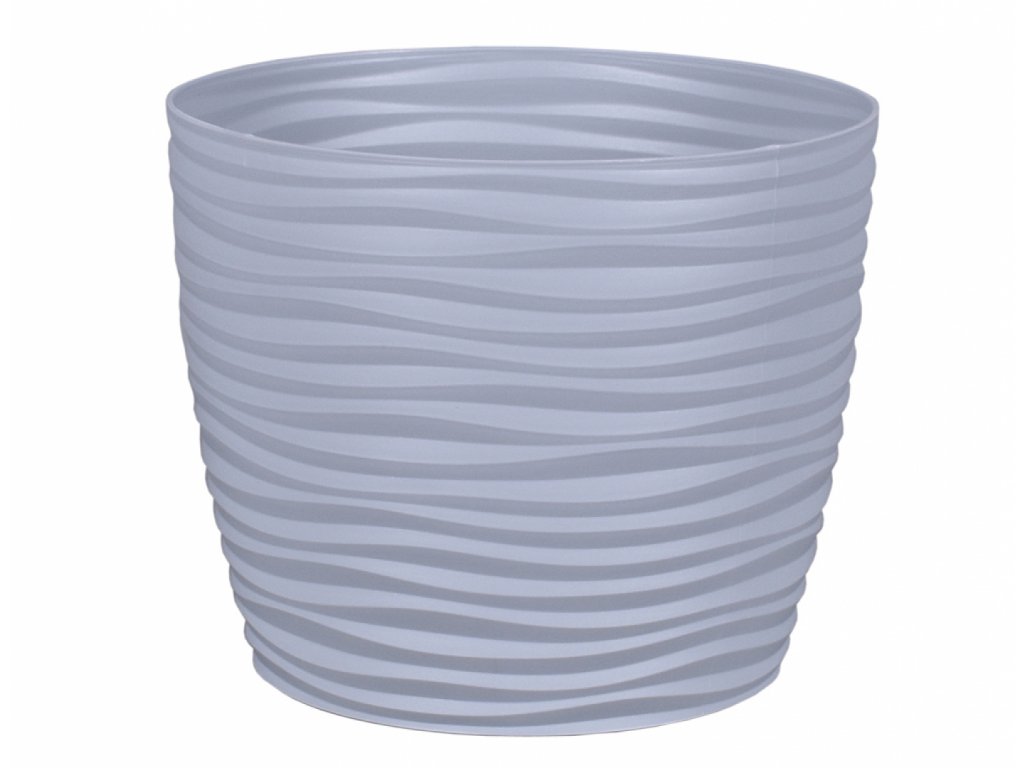 Matný plastový obal na květník s jemnými vlnkami po celém obvodu. Kruhového půdorysu. Neotřelý design a trendy barva osvěží každý interiér. Průměr: 17 cm, výška: 14 cm. Barva: šedá.Doplňkové parametry