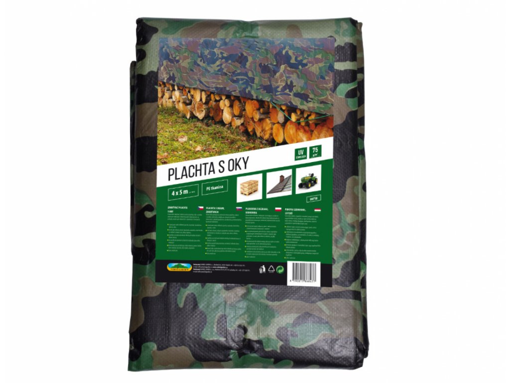 Plachta maskovací, k univerzálnímu použití. Materiál: HDPE + LDPE. Zakrývá, izoluje a stíní. Chrání proti vodě a vlhkosti, prachu, mastnotě, slunečnímu záření a větru. Pro celoroční použití v domácnosti, na zahradě, stavbě a při rekreačních a sportovních činnostech. Má kovová oka pro lepší uchycení, která jsou umístěna po celém obvodu plachty. Barva: kamufláž. Gramáž: 75 g/m2. Délka: 5 m, šířka: 4 m.Doplňkové parametry
