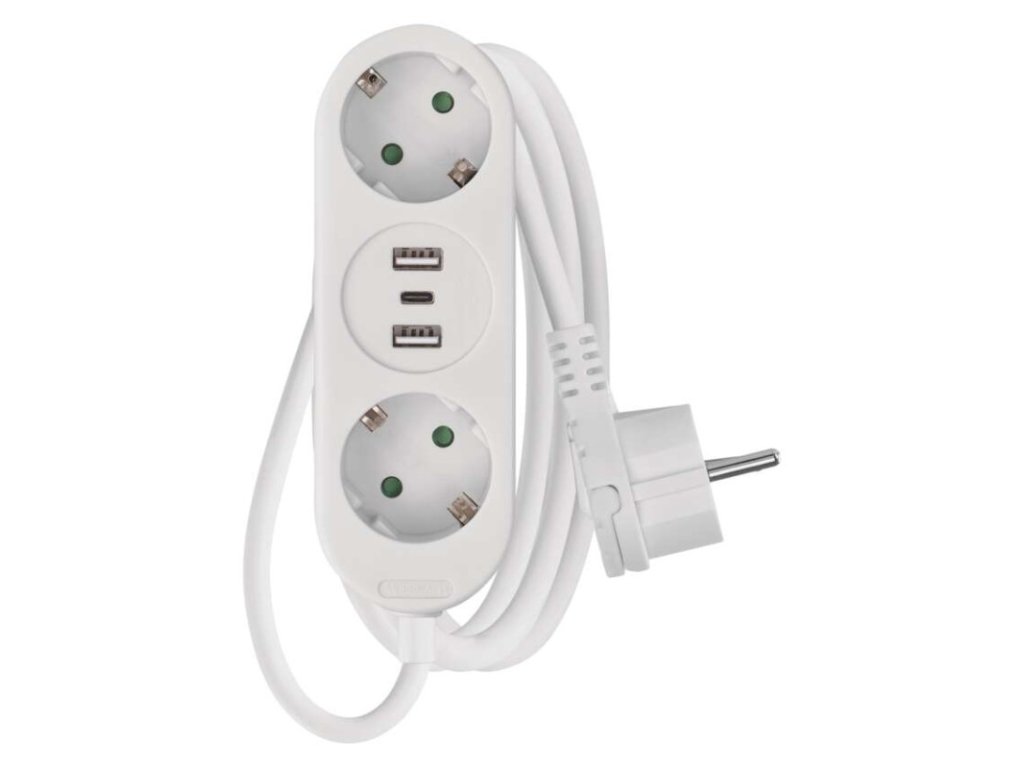 Produkt: Prodlužovací kabel 1,5 m / 2 zásuvky+2×USB A+1×USB C / bílý / PVC / 1,5 mm2Technické parametry: