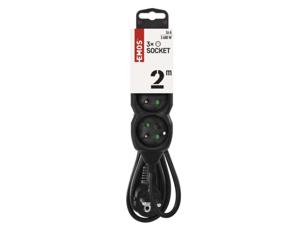 Produkt: Prodlužovací kabel 2 m / 3 zásuvky / černý / PVC / 1 mm2Technické parametry: