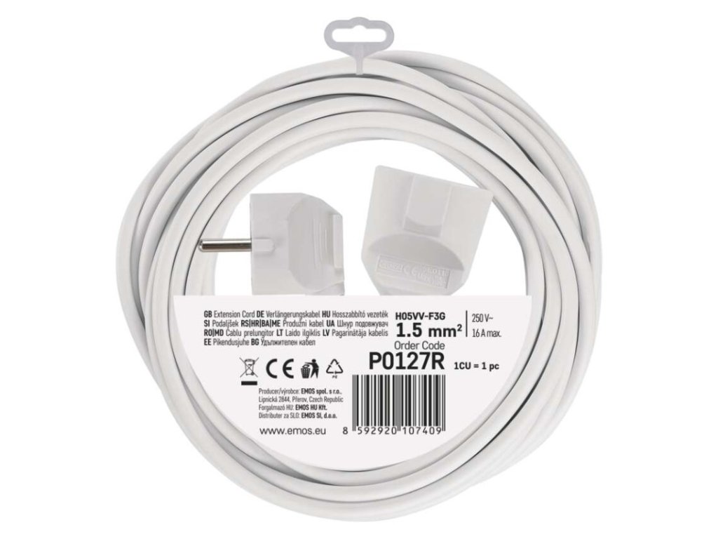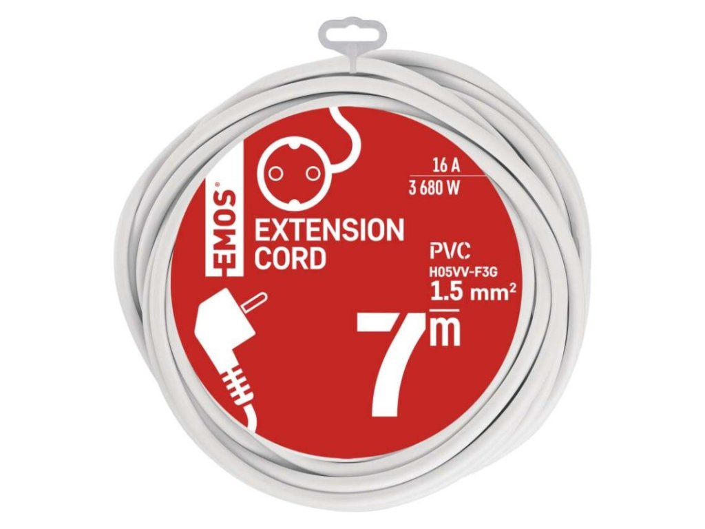 Produkt: Prodlužovací kabel 7 m / 1 zásuvka / bílý / PVC / 1,5 mm2Technické parametry: