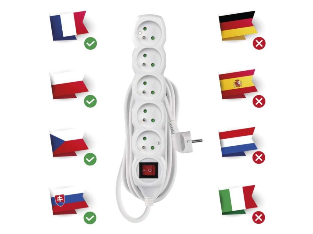 Produkt: Prodlužovací kabel 7 m / 5 zásuvek / s vypínačem / bílý / PVC / 1,5 mm2Technické parametry: