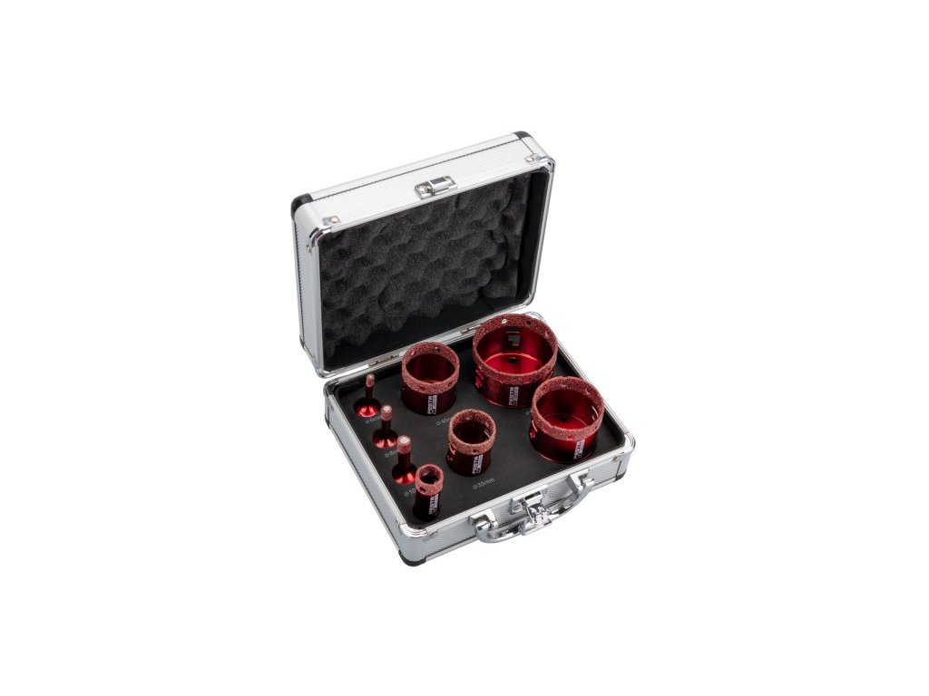 - sada diamantových vrtacích/vykružovacích korunek s nejpoužívanějšími průměry - 6, 8, 10, 20, 35, 45, 55, 68 mm
