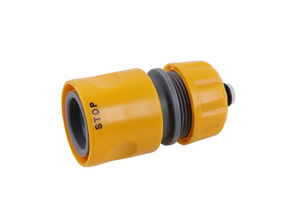 - stop pojistka pro samovolné uzavření proudu vody při sejmutí pistole, zavlažovače nebo při přepínání na jiný kohout - tlak vody svým vlastním tlakem uzavře těsnící pohyblivou klapku uvnitř rychlospojky