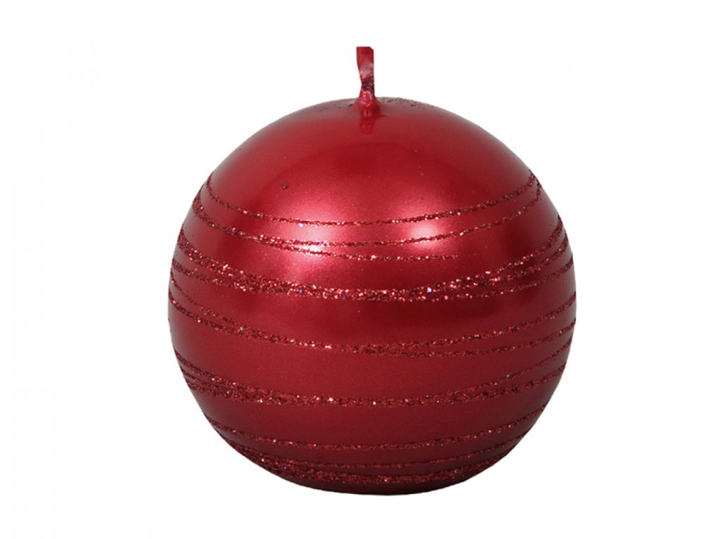 Červená vánoční svíčka ve tvaru koule zdobená červenými glitrovými proužky. Velikost: d6 cm.Doplňkové parametry