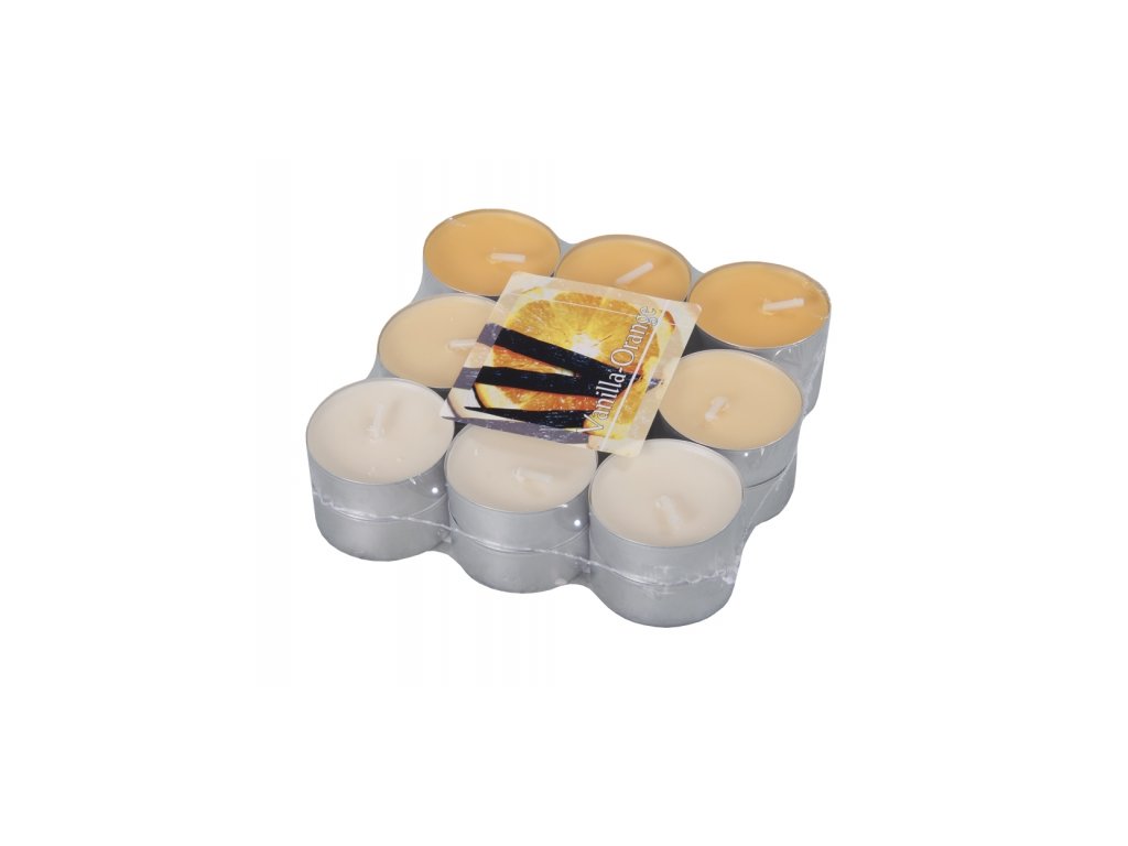 Čajové svíčky bílé, světle oranžové a tmavě oranžové barvy s vůní vanilky a pomeranče v hliníkovém kalíšku. Baleno po 18 kusech (3 řady po 3 kusech, 2 vrstvy) v igelitu s obrázkem rozkrojeného pomeranče a vanilkových lusků.Doplňkové parametry