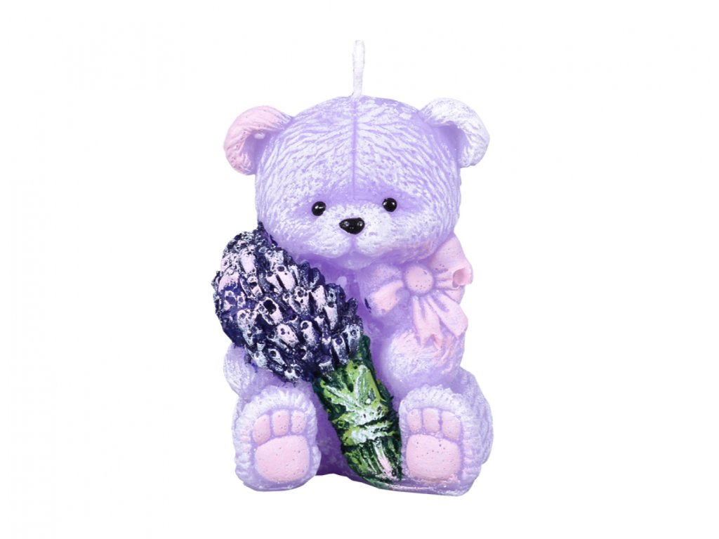 Figurální svíčka imitující medvídka. Dekorován kyticí levandule. Svíčka voní po levanduli. Roztomilá ozdoba domova a pěkný dárek. Doba hoření: 2 hodiny. Rozměry: 6 x 8 cm. Barva: fialová.Doplňkové parametry