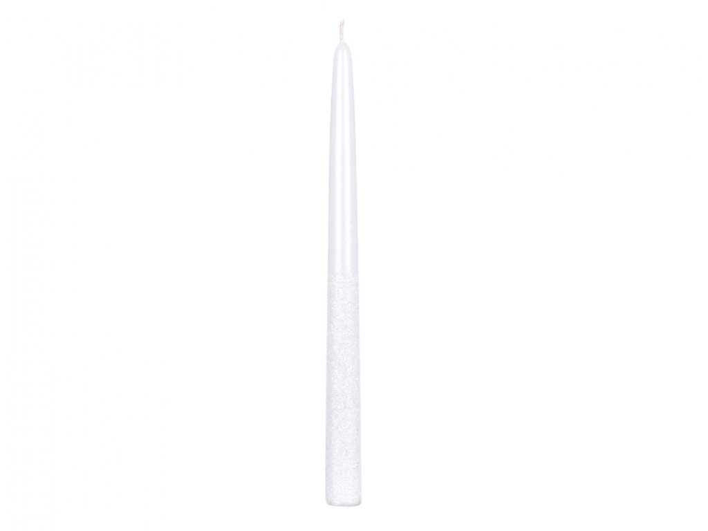 Stolní svíčka kónická s glitrovaným povrchem. Vhodná do vazeb a svícnů zejména v období Vánoc. Zaujme svým oslnivým třpytem. Rozměry: spodní průměr 2 cm, výška 29 cm. Doba hoření: 8 hodin. Barva: bílá.Doplňkové parametry