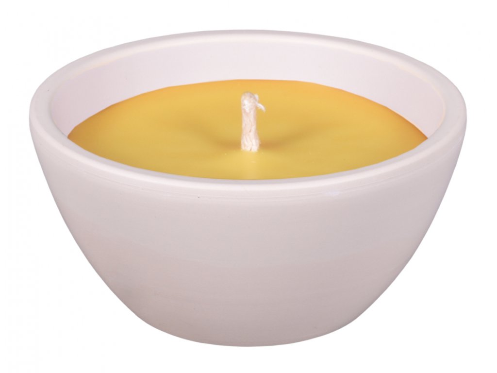 Vonná svíčka v misce z bílého jílu. Svíčka má jeden knot a voní po citronele, tradičnímu nástroji na odpuzování obtížného hmyzu. Vhodná pro použití v exteriéru. Neobsahuje palmový olej. Hmotnost náplně: 370 g. Rozměry: průměr 15 cm, výška 7 cm. Barva: žlutá. Doba hoření je 13hodin.Doplňkové parametry