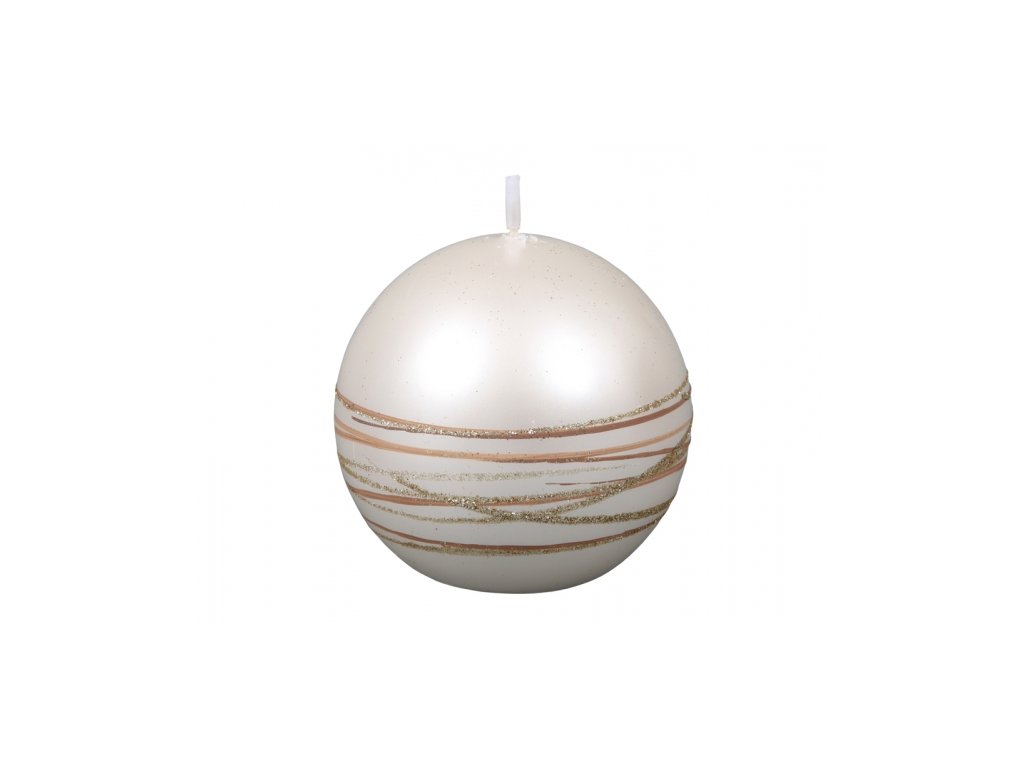 Bílá vánoční svíčka ve tvaru koule je zdobena namalovanými béžovými proužky a zlatými glitrovými proužky po celém obvodu. Průměr: 6 cm.Doplňkové parametry