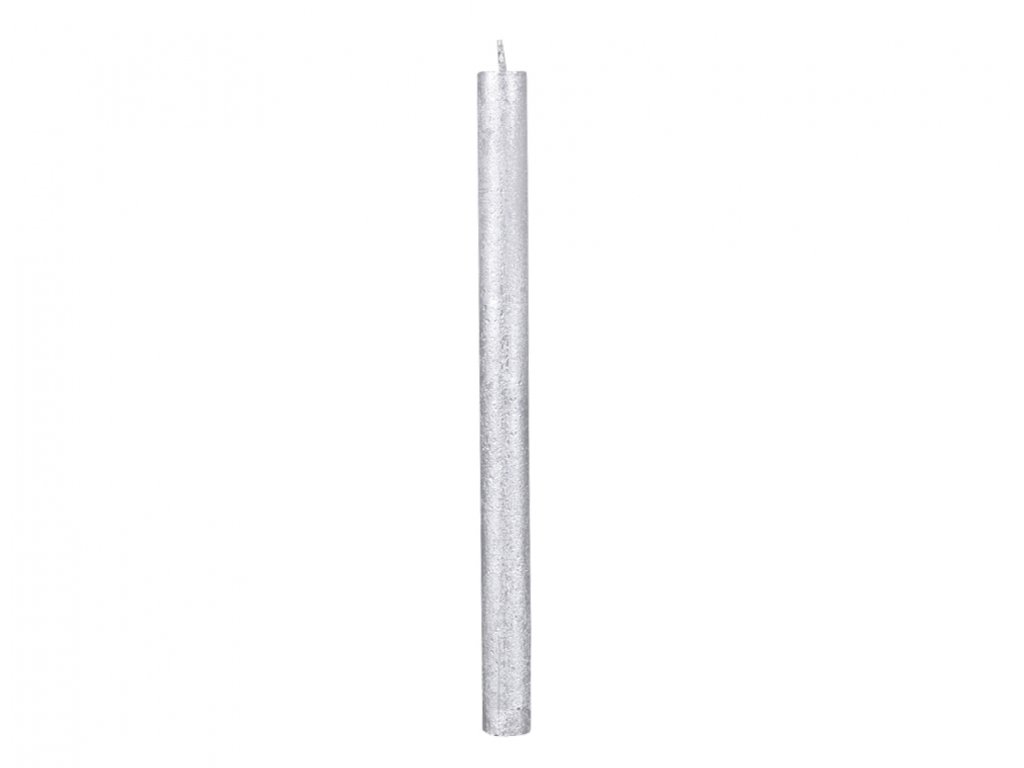 Stolní svíčka s rustikálním dekorem v metalickém provedení. Ve tvaru válce, s plochou hlavou. Hodí se do dobového, rustikálního i moderního interiéru. Doba hoření: 15 hod. Rozměry: průměr 2 cm, výška 30 cm. Barva: stříbrná.Doplňkové parametry