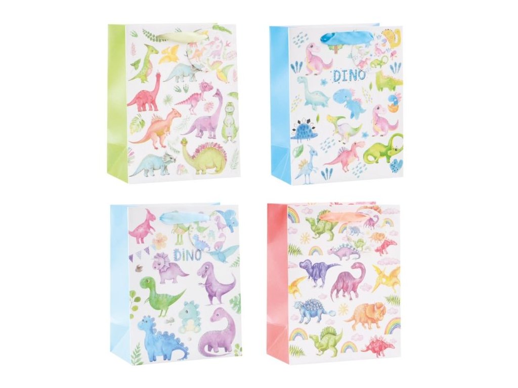 Produkt: taška dárk. M, DINO s glitry, DĚTSKÁ, 4 barvy, 23x18x10cm, papírV případě požadavku konkrétní barvy nás prosím kontaktujte a prověříme její dostupnost.Originálním dárkem v této krásné tašce jistě uděláte velikou radost!