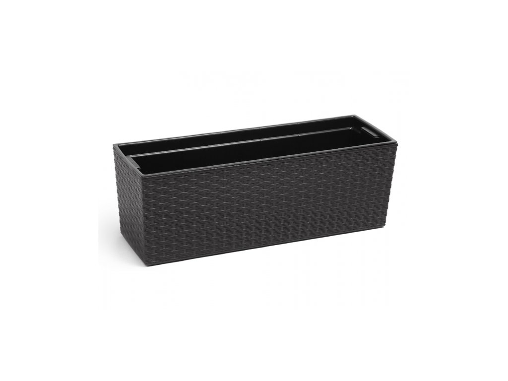 Plastový truhlík má unikátní vzhled připomínající proutí. Je vhodný do interiéru i venkovních prostor, je odolný vůči UV záření. Barva: černá. Šířka: 56 cm, výška: 19 cm.Doplňkové parametry