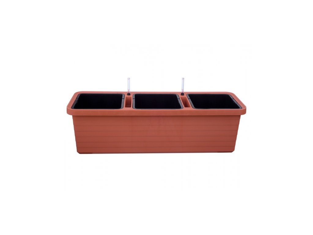 Velkoobjemový samozavlažovací truhlík v moderním designu. Obsahuje 3 samostatně vyjímatelné nádoby. Skvěle se hodí pro pěstování zeleniny, květin, drobných keřů a bylin. Zalévání je beztarostné - má velkou zásobárnu vody (27 l) s hladinoměrem, dostatečně velký otvor pro zalévání a přepad vody. Je vhodný na terasu, balkón a do zahrady. Příslušenství: 8 koleček, 3 knoty, 2 hladinoměry, 6 úchytů. Šířka: 117 cm, výška: 35 cm, hloubka: 39 cm. Rozměry jednotlivé nádoby: 33 x 33 cm, objem jednotlivé nádoby: 18 l.Doplňkové parametry