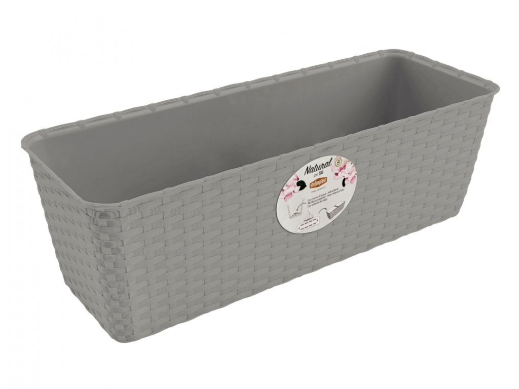 Plastový truhlík se samozavlažovacím systémem. Design věrně imituje ratanový výplet. Barva: šedá. Šířka: 30 cm, výška: 11 cm, hloubka: 13 cm.Doplňkové parametry