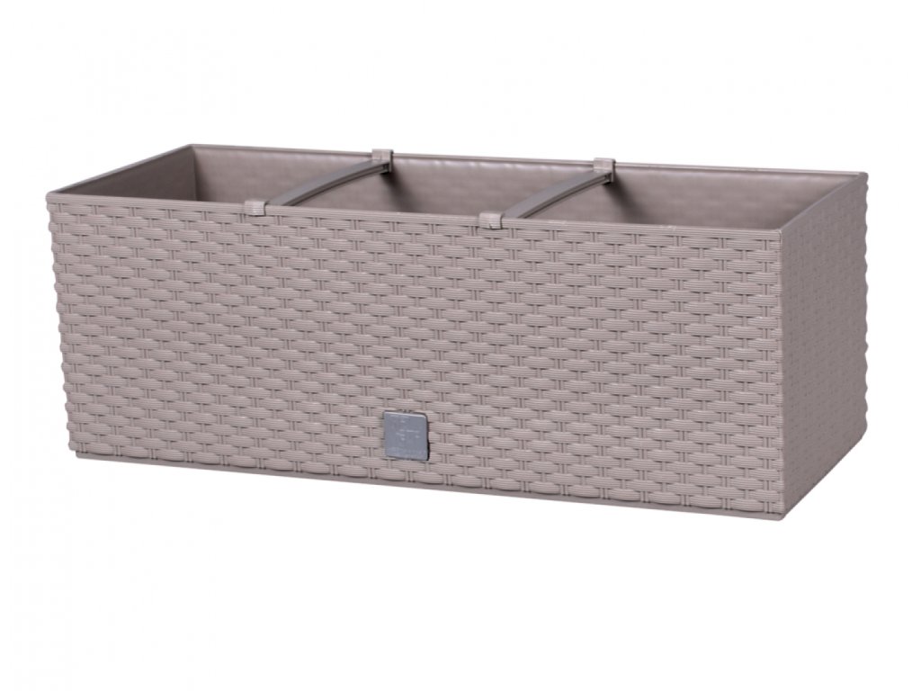 Plastový samozavlažovací truhlík s texturou imitující ratanový výplet. Tento truhlík je skvělým doplňkem stylových interiérů. Je vhodný do interiéru i exteriéru, je odolný vůči UV záření. Součástí je černá vnitřní vložka se 2 rozpěrkami. Barva: hnědo šedá. Šířka: 60 cm, výška: 24 cm.Doplňkové parametry