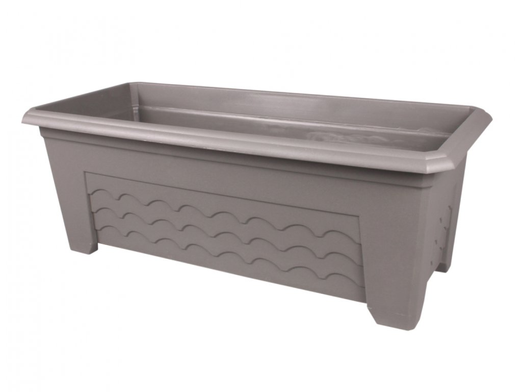 Plastový, matný truhlík obdélníkového půdorysu. Obal stojí na krátkých nožičkách, které jsou prodlouženy až k okraji obalu a tvoří zajímavý ozdobný prvek. Zdobení je dále doplněno hravými, vylisovanými vlnkami. Obal má zahnutý okraj pro praktickou manipulaci. Délka: 80 cm, šířka: 29 cm, výška: 35 cm. Barva: hnědo-šedá.Doplňkové parametry