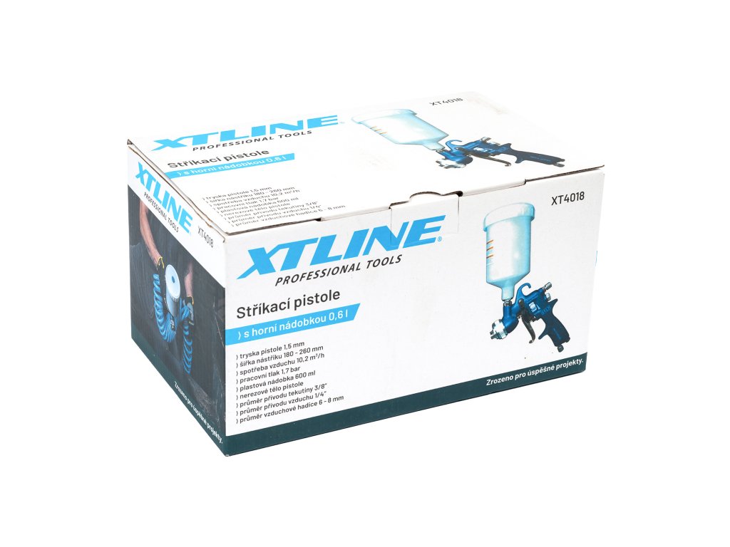 Produkt: XTLINE Pistole stříkací s horní nádobkou | 0,6 l, velikost trysky 1,5 mmStříkací pistole s horní nádobkou o objemu 600 ml se širokou stříkací tryskou 1,5 mm (rozstřik 260 mm). Vhodná pro nanášení barev a laků, výborná pro vodou ředitelné nástřiky, pro profesionální použití, autolakýrníky, truhláře apod. Nerezové tělo pistole. Možnost regulace přívodu vzduchu, množství barvy a nastavení trysky. Velmi přesné a kvalitní zpracování komponentů.