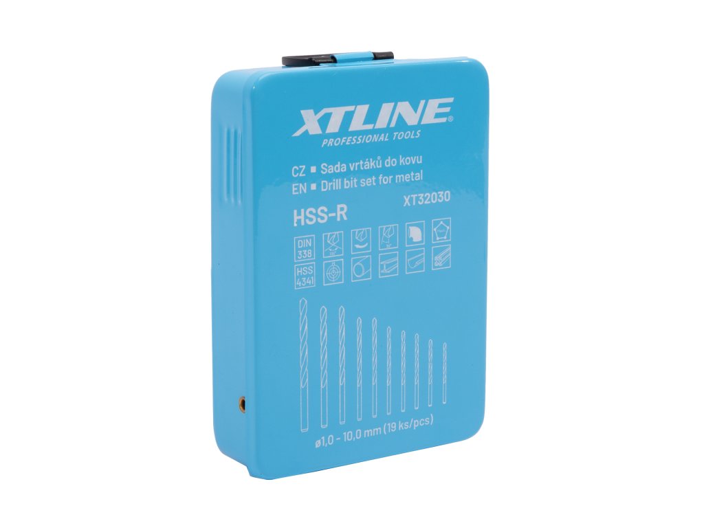 Produkt: XTLINE Sada vrtáků do kovu HSS-R | 1-10 mm 19 dílů, kovový obalSada vrtáků do kovu vyrobených z HSS oceli. Vrtáky jsou uloženy v kovovém boxu. Lze opětovně brousit.