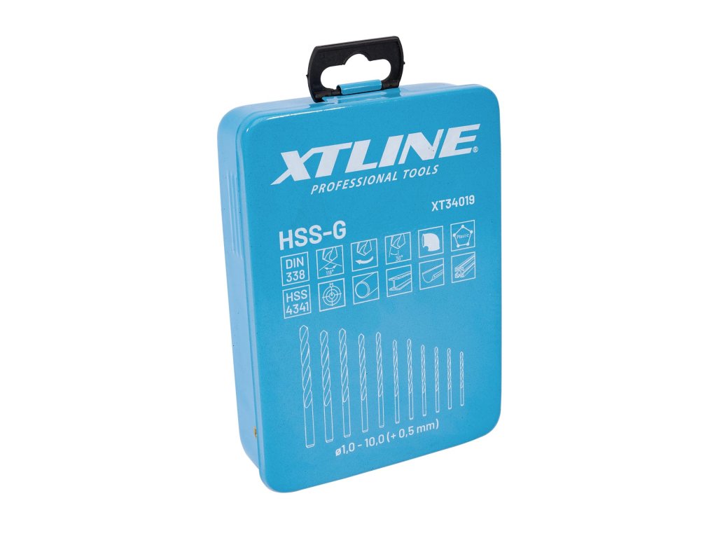 XTLINE Sada vybrušovaných vrtáků do kovu HSS-G, 19 dílů | 1-10 mm, kovový box