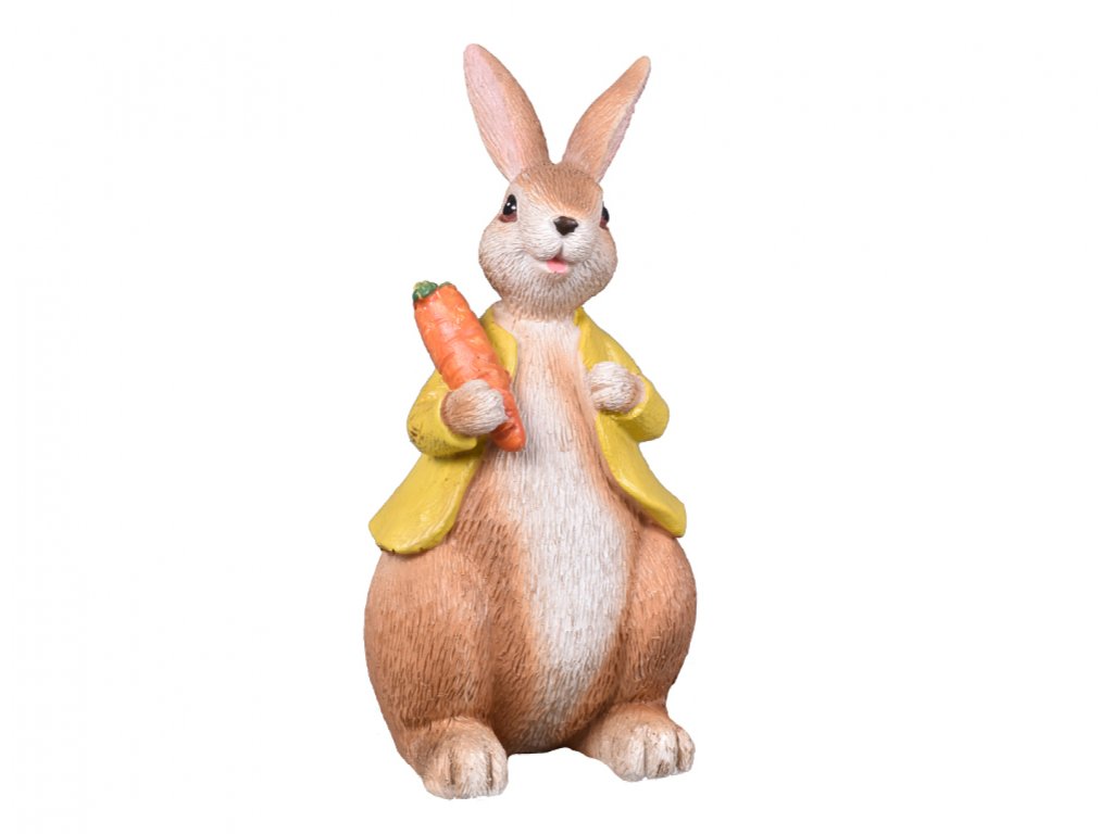Dekorace v podobě zajíce s mrkví. Je vyrobena z polyresinu, který vyniká svojí odolností, což ho předutčuje být vhodným materiálem pro různé povětrnostní podmínky. Vhodná do interiéru i exteriéru. Vhodná sezóna: jaro, velikonoce. Rozměry: délka 8 cm, hloubka 7 cm, výška 15 cm. Barva: mix barev, žlutý kabátek.Doplňkové parametry